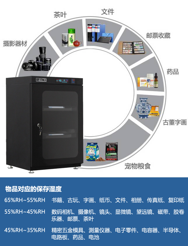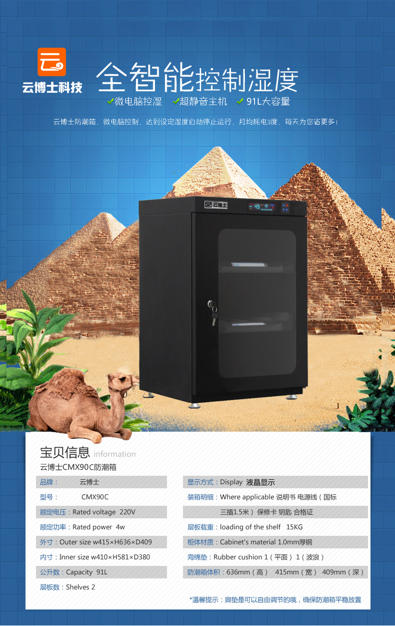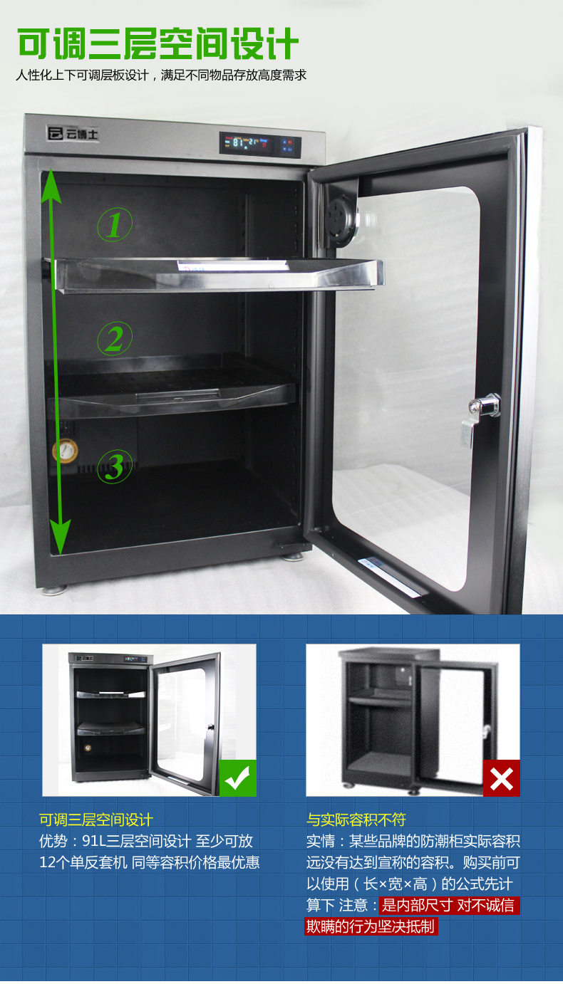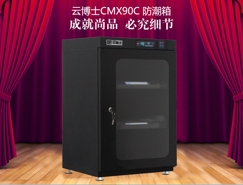 云博士CMX90C单反干燥柜采用最新钣金镭射切割技术,密封性能好,双传感器主机除湿更快,防潮效果佳,温湿度显示由原装进口液晶显示,梅雨季节防潮必备,此款为90L,2块层板,2块海绵垫,平面波浪各一块,镜头存放更安全,入门级摄影爱好者青睐,可存储相机6-8个,镜头4-5个,我们专注镜头防潮。