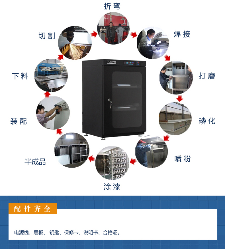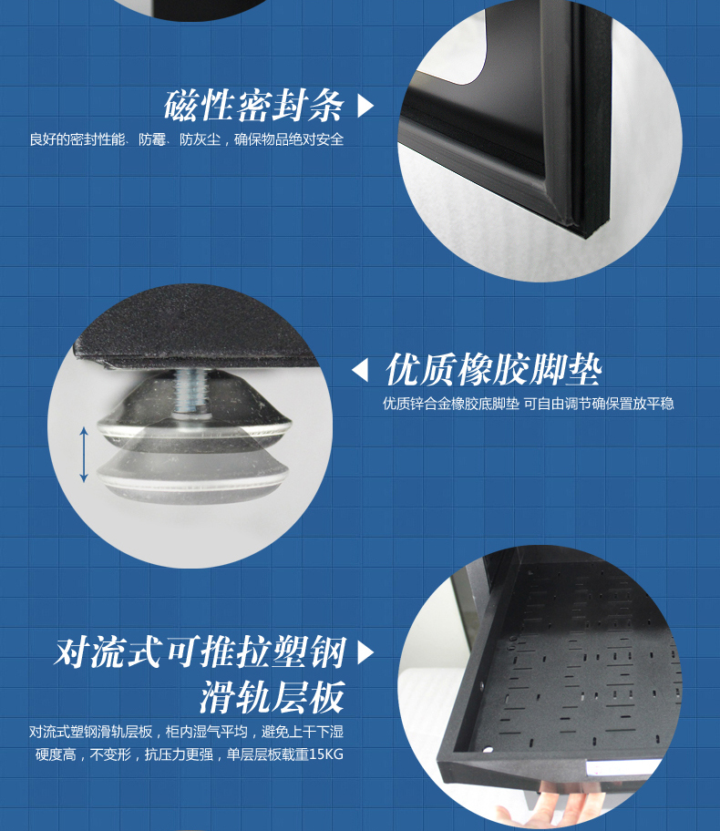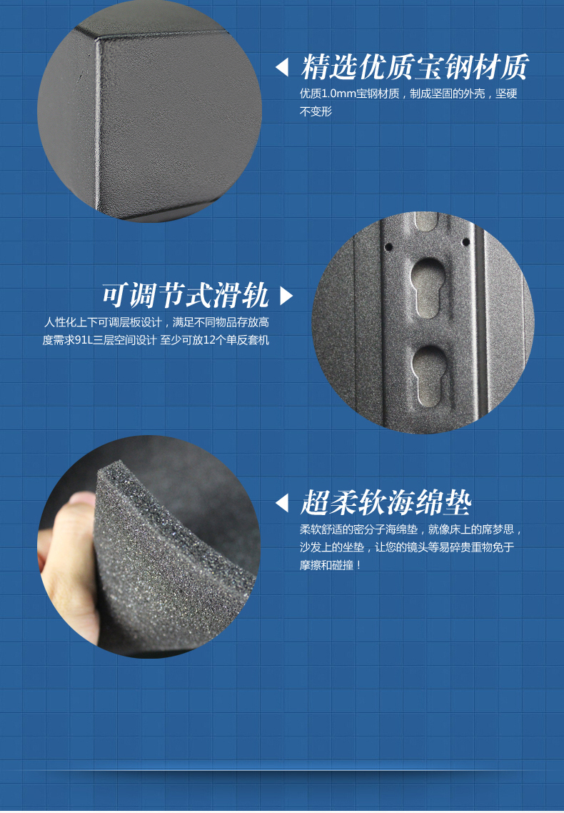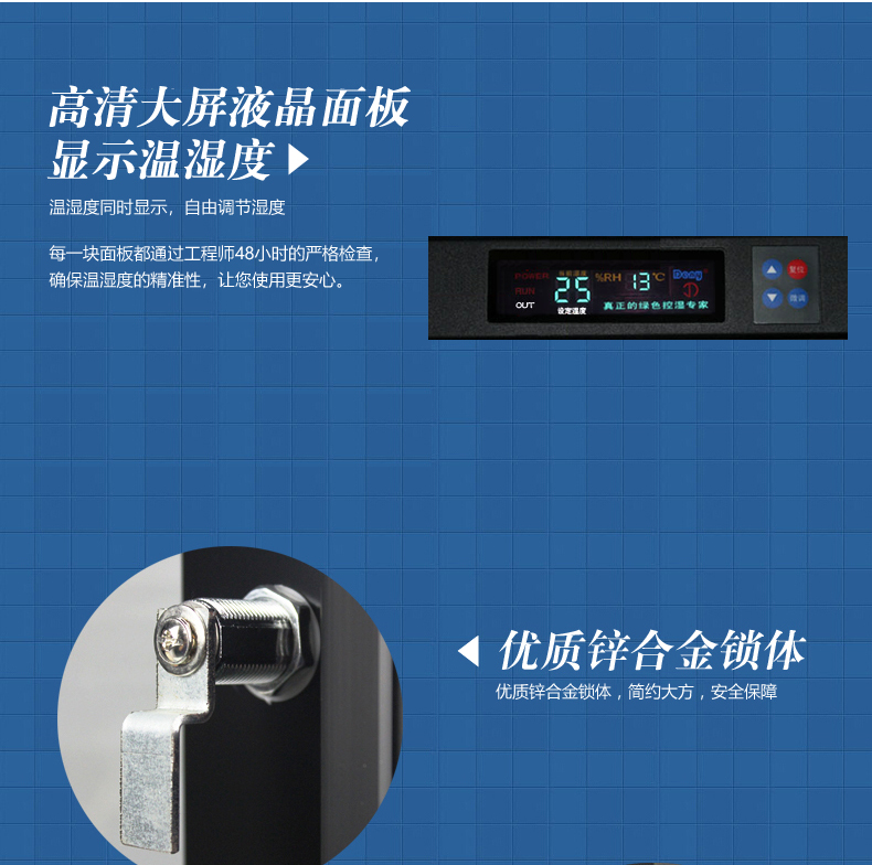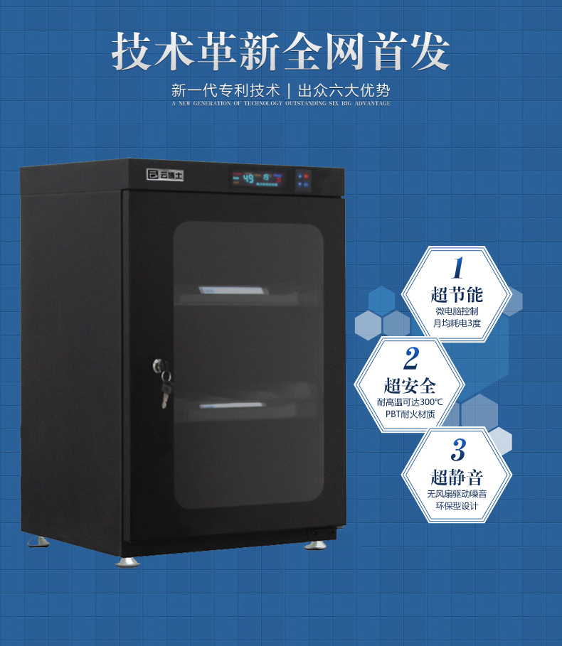 云博士CMX90C单反干燥柜采用最新钣金镭射切割技术,密封性能好,双传感器主机除湿更快,防潮效果佳,温湿度显示由原装进口液晶显示,梅雨季节防潮必备,此款为90L,2块层板,2块海绵垫,平面波浪各一块,镜头存放更安全,入门级摄影爱好者青睐,可存储相机6-8个,镜头4-5个,我们专注镜头防潮。