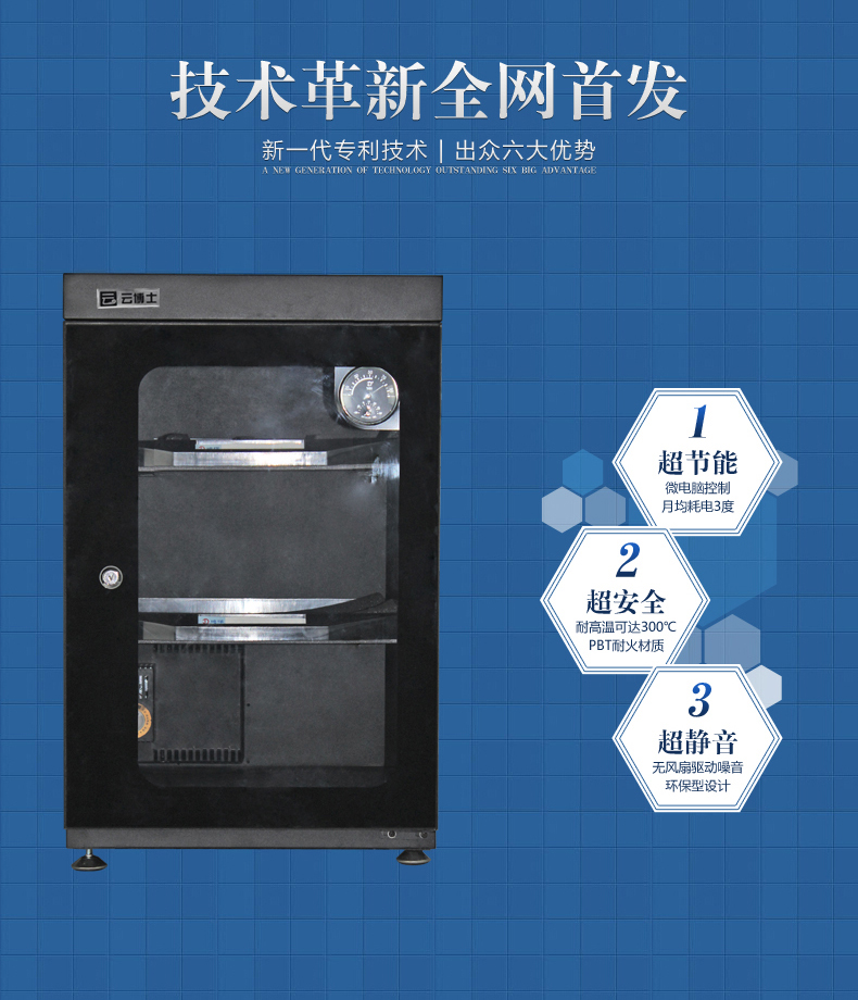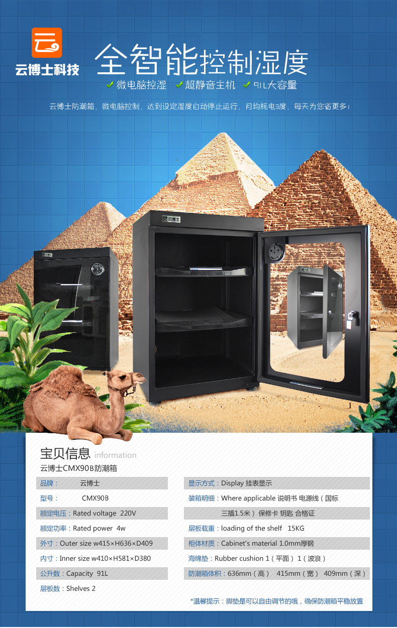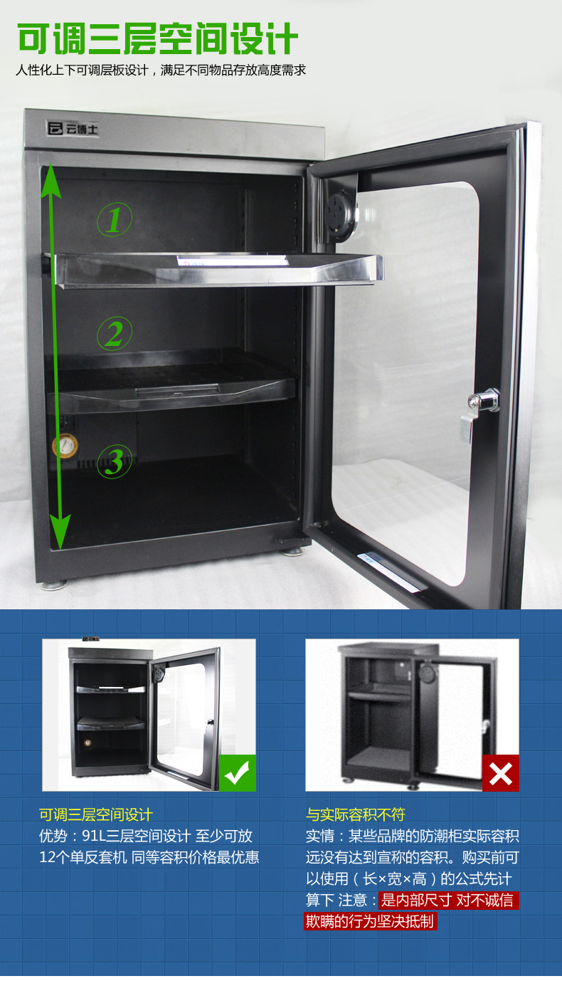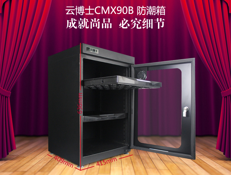 云博士CMX90B单反干燥柜采用最新钣金镭射切割技术,密封性能好,双传感器主机除湿更快,防潮效果佳,温湿度显示由德国进口挂表显示,梅雨季节防潮必备,此款为90L,2块层板,2块海绵垫,平面波浪各一块,镜头存放更安全,入门级摄影爱好者青睐,可存储相机6-8个,镜头4-5个,我们专注镜头防潮。