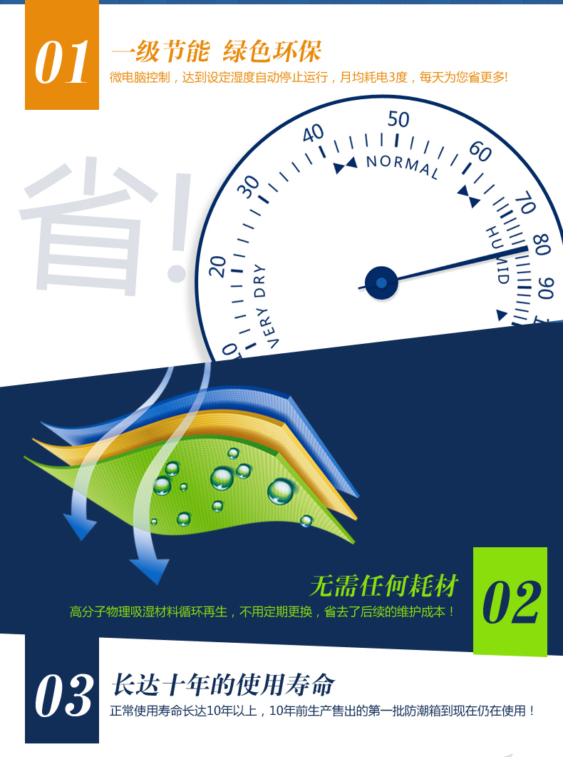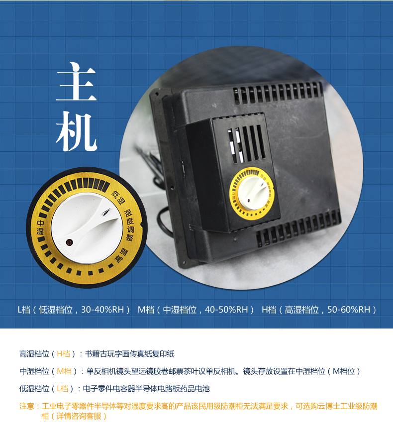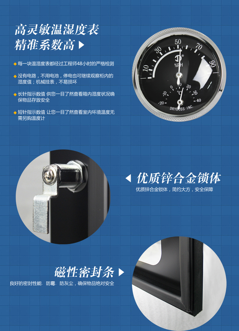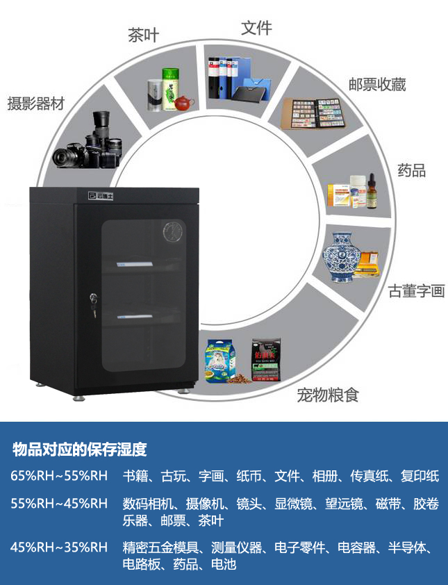 云博士CMX90B单反干燥柜采用最新钣金镭射切割技术,密封性能好,双传感器主机除湿更快,防潮效果佳,温湿度显示由德国进口挂表显示,梅雨季节防潮必备,此款为90L,2块层板,2块海绵垫,平面波浪各一块,镜头存放更安全,入门级摄影爱好者青睐,可存储相机6-8个,镜头4-5个,我们专注镜头防潮。